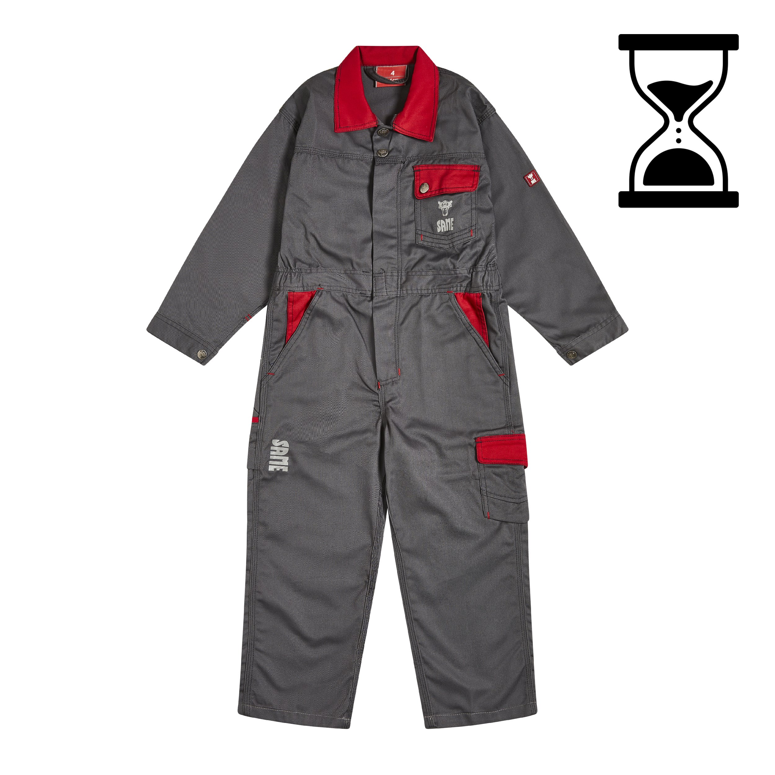 Tuta da lavoro con collo a camicia in tessuto twill di cotone resistente e durevole, 240 gmq. Stampa logo SAME in materiale riflettente sia sul davanti  che sul retro della tuta, ginocchia sagomate ed ergonomiche, orlatura estensibile, numerose tasche con funzioni differenti e svariati dettagli di colore rosso a contrasto.
